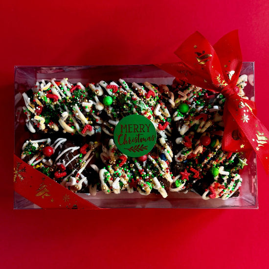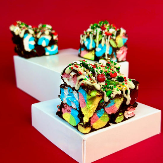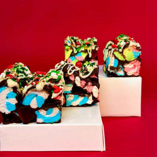 Each of these delightful festive themed Rocky Roads are packed with dark chocolate, marshmallows, gummy candies and topped off with festive Christmas sprinkles.