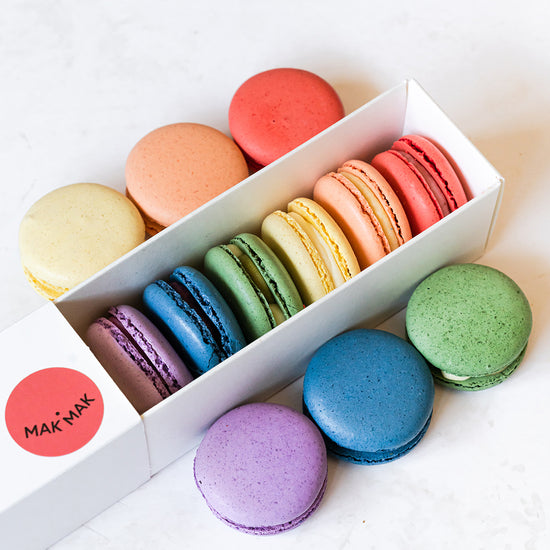 These rainbow macarons will put a smile on anyone's face when they receive them. The macarons come in a box of 6 and 14.